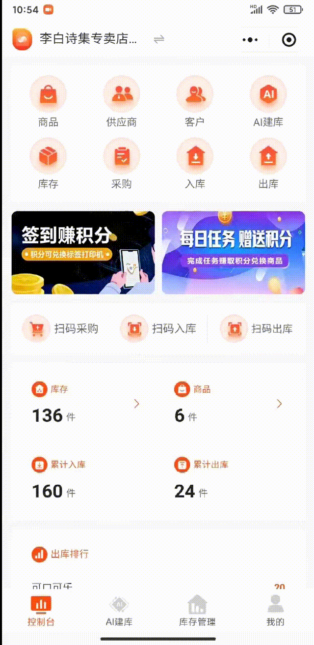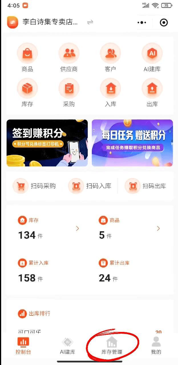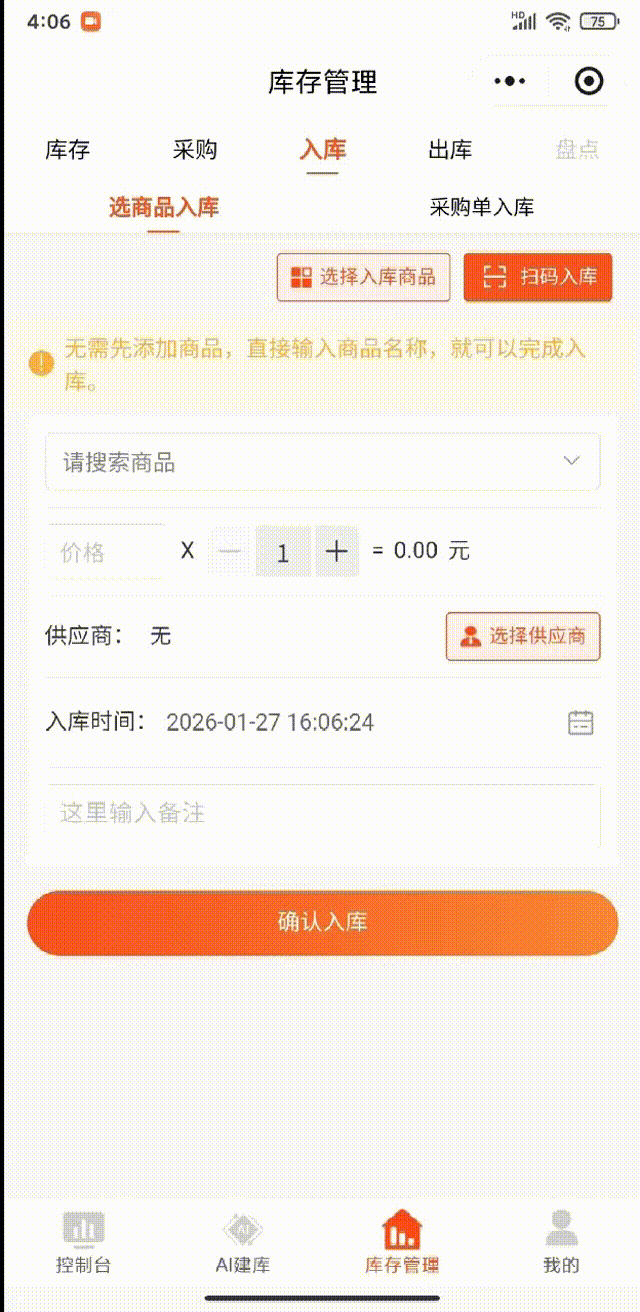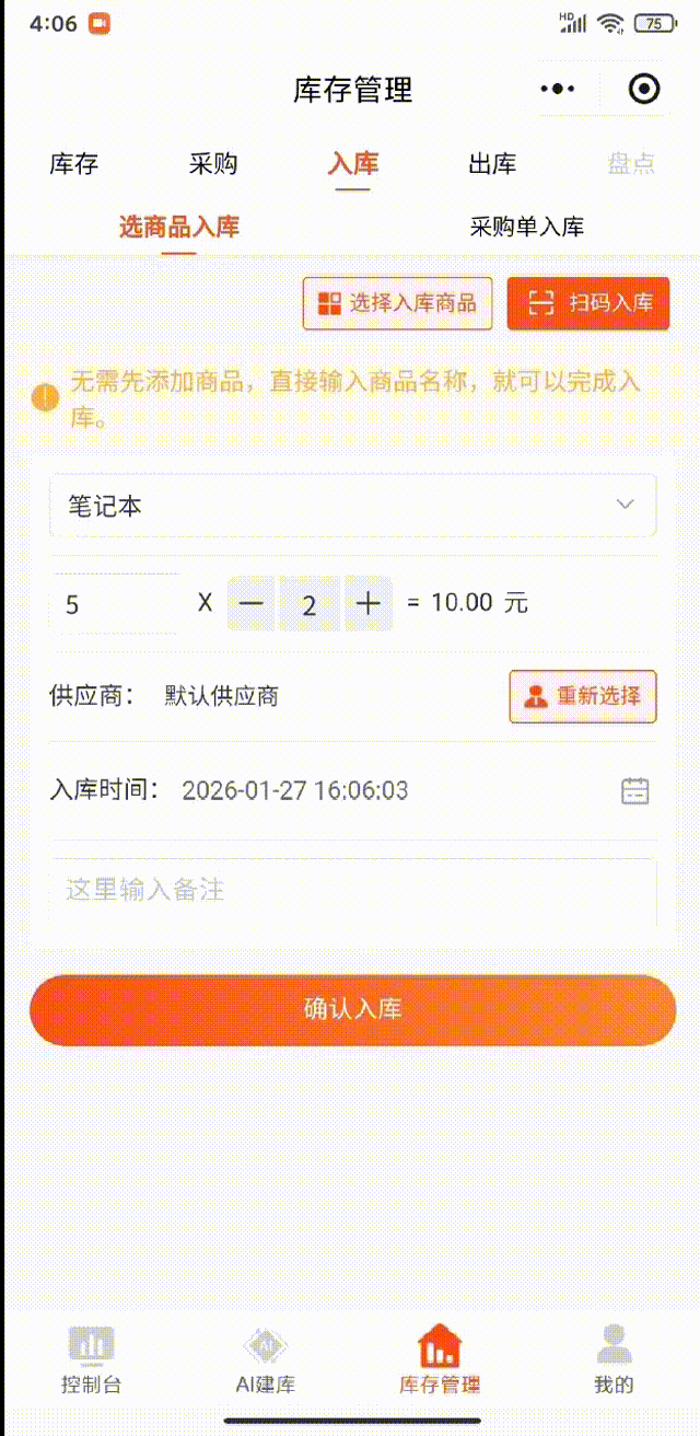 (2)或者你也可以在首页点击【入库】一键直达商品入库