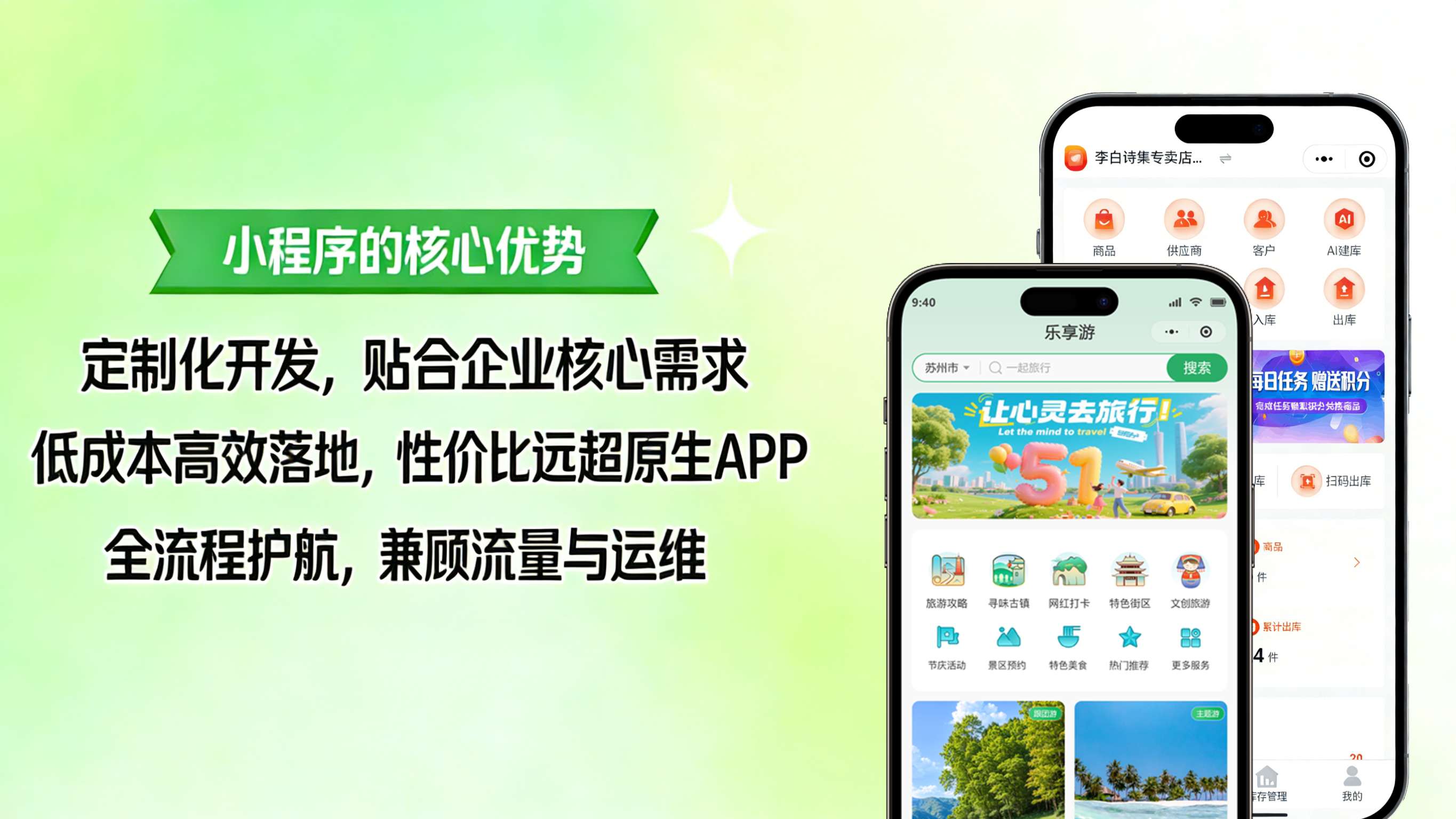相较于原生APP,我们的小程序开发更贴合移动用户使用习惯,无需下载安装、即用即走,无需占用手机内存,同时集成支付、登录等核心功能,无缝适配各类企业运营需求,轻松实现用户触达与业务转化。