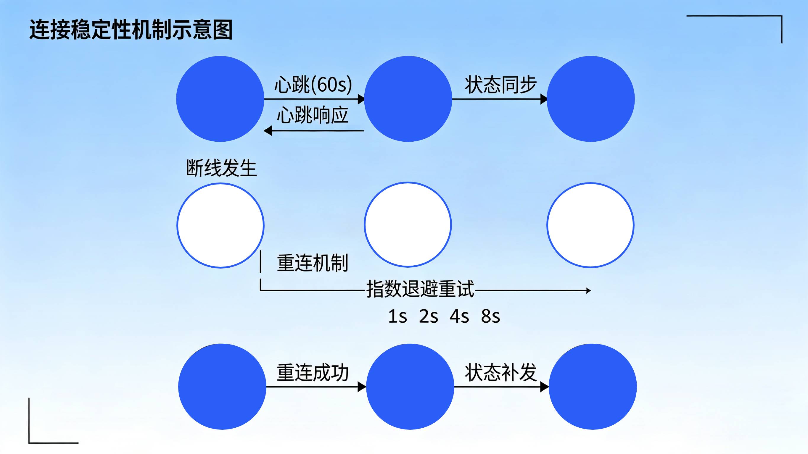 设备检测到网络断开后,立即尝试重连。重连采用指数退避策略:第一次1秒后重试,第二次2秒,第三次4秒……避免频繁重连加重服务器负担。