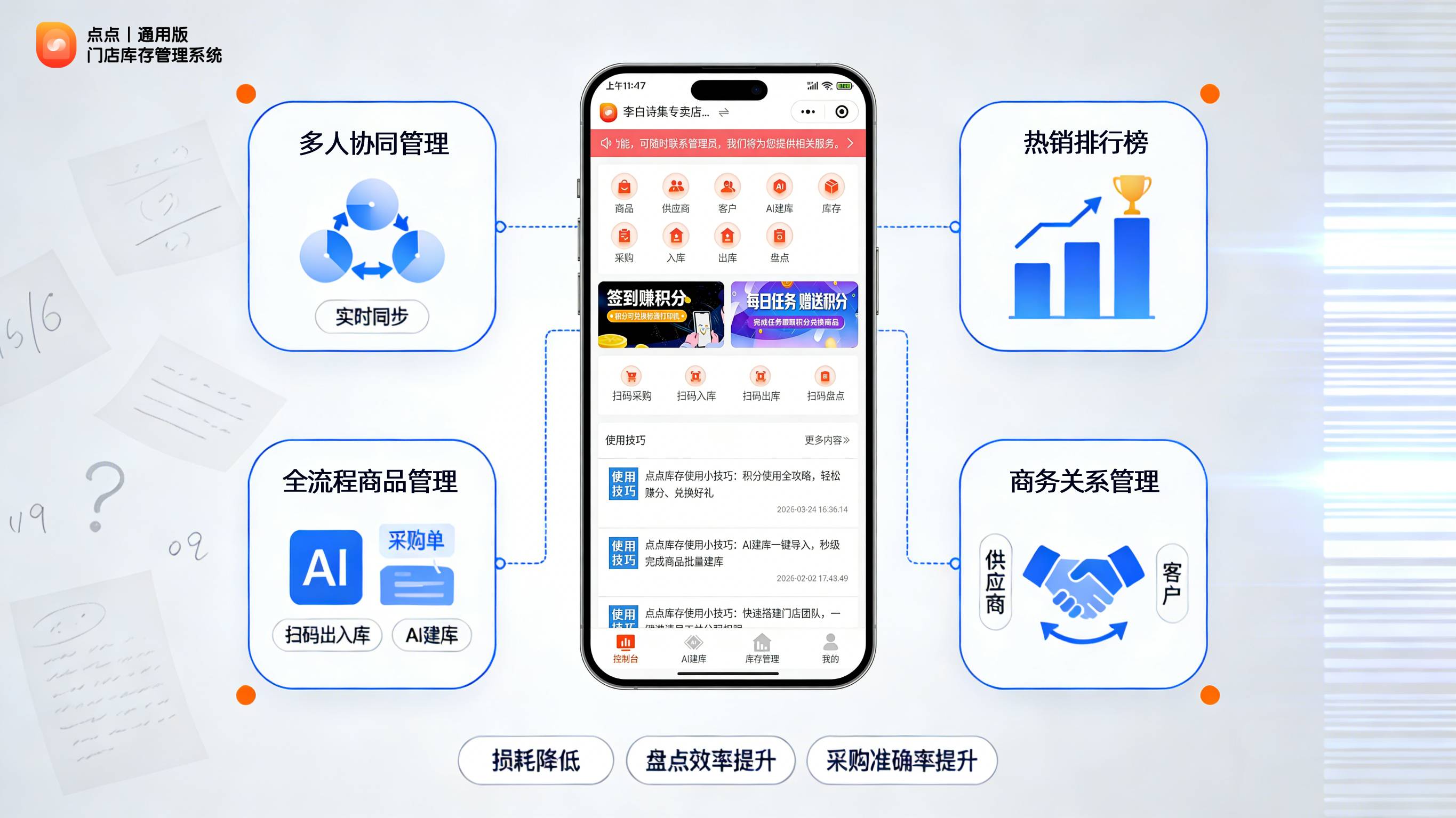 轻量便捷:无需采购专用收银或盘点设备,一部手机即可完成全部操作。